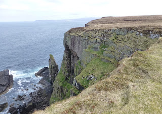 Basically they've carved out a 4 mile footpath around the island, much of it duck-boarded. The instructions were to keep to the path, for the protection of nesting birds. Actually wander too far of the path towards the nest site of a Great Skua and you'd soon know about it as you were subject to a vicious aerial attack. No Red Grouse spotted on the way up to the cliffs and no Puffin to be seen amongst the thousands of Guillemots and Razorbills, sharing the cliff face with the Kittiwakes and Fulmars. Then a Puffin, then another, and another, and one flying. Once we knew where to look spotting them was easy. Liz was overjoyed – having missed them at Shetland 6 years ago she at last gets to watch the cute little birds, most of which seemed to be collecting grass to line their burrows. On around the clifftop and another puffin village atop cliffs teeming with Guillemot. A little Wheatear on the grass just a few metres away seems totally strange and at first hard to identify, normally it the flash of white rump as they zoom past so seeing one close up face on is definitely different. Arctic Skua, eider, meadow pipits, crows, rock dove and some glorious skylarks completed the round-up. Well apart from the various gulls and a few divers to far away to identify throat colouredness.