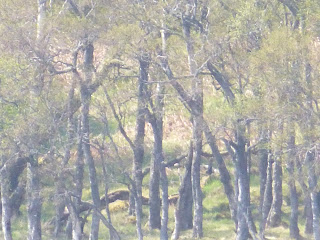 Leaving the hide we pause and meet up with one of the other 3 watchers, she was playing a different game, using a long lensed camera. She tells it the game she was hoping to play was trying to catch the regularly visiting osprey in pursuit of fish. We return to the van with much sadness, an osprey fishing would have been well cool. Still the sandwiches were good, the local smoked sea trout being excellent. Half way through the repast Liz quietly wonders "What's that big bird", knowing the answer. Yep, there's an osprey over the loch, not diving after fish but circling around looking for the best hunting spots. Well cool! And it's not too far away to see clearly with the bins either. Excellent.